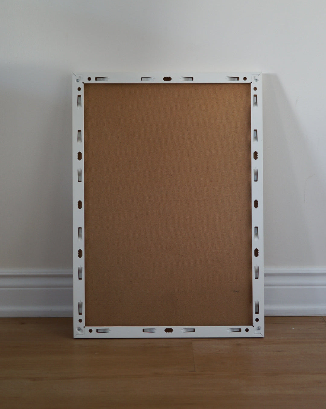 Vintage, printed in 1994. White metal frame with plastic cover. No wire, but tons of holes in the back for hanging (see second last photo). Muted blue and yellow colours.